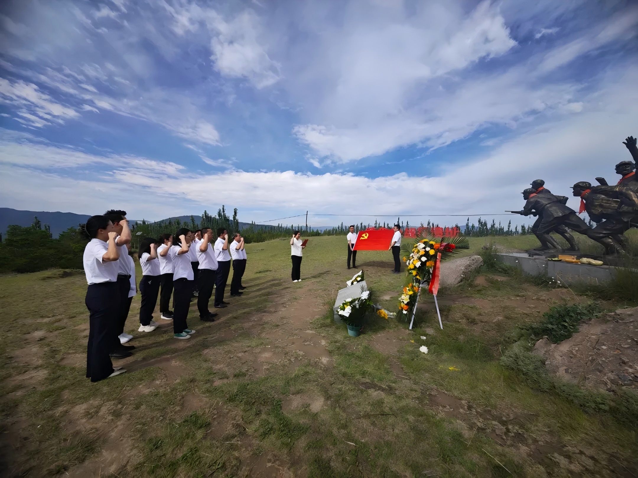 學(xué)習(xí)結(jié)束,全體黨員前往蘭州戰(zhàn)役營盤嶺遺址,在遺址前肅立默哀,向在戰(zhàn)役中英勇犧牲的革命先烈表達深切緬懷與崇高敬意。現(xiàn)場氣氛莊嚴(yán)肅穆,黨員們低頭默哀,思緒仿佛穿越時空,回到了那段戰(zhàn)火紛飛的崢嶸歲月,先烈們沖鋒陷陣、舍生忘死的英勇壯舉,深深震撼著每一個人,也讓大家更加深刻地認(rèn)識到和平生活的來之不易。