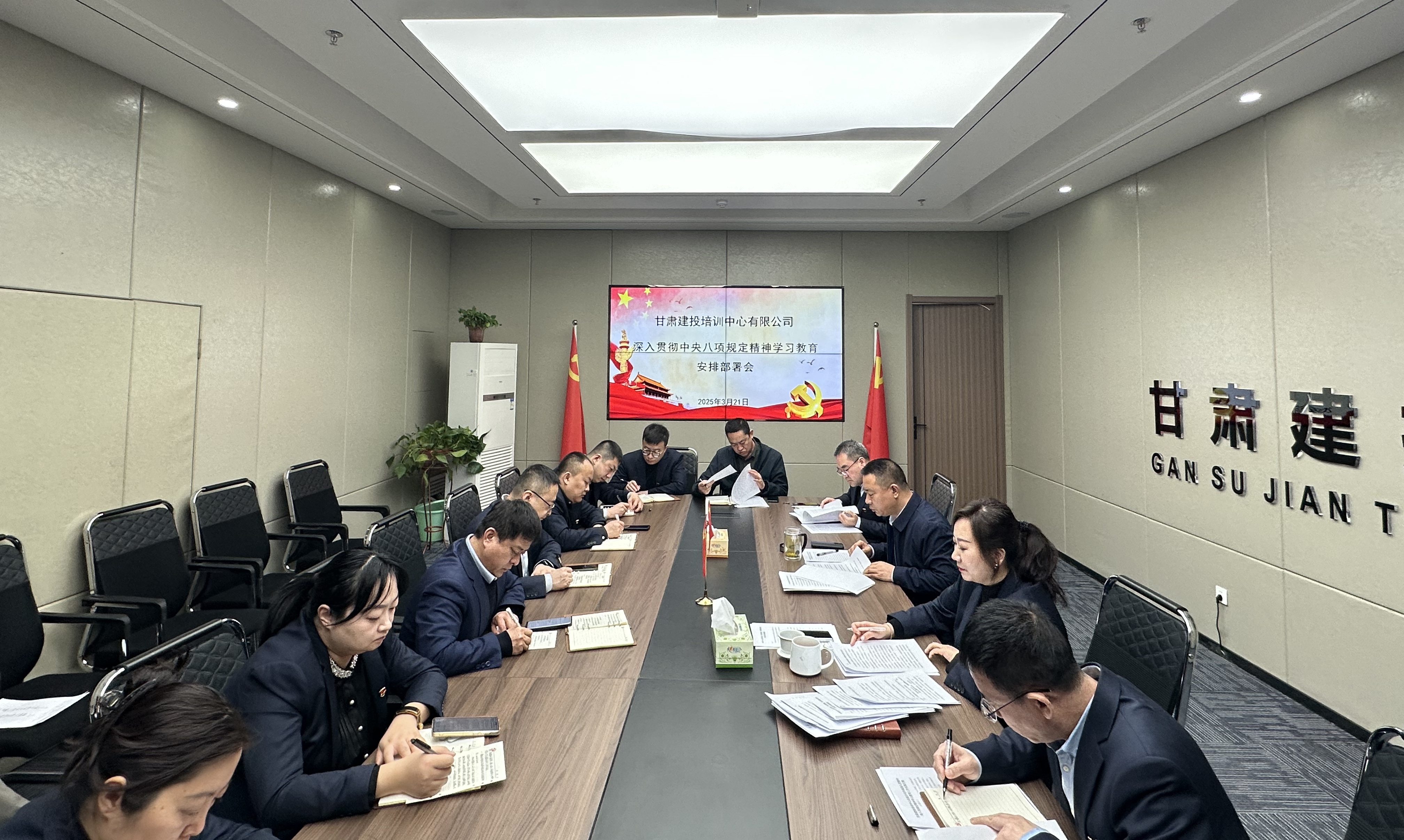3月21日,甘肅建投培訓(xùn)中心有限公司黨支部召開深入貫徹中央八項(xiàng)規(guī)定精神學(xué)習(xí)教育安排部署會(huì)。會(huì)議落實(shí)“第一議題”制度,由公司董事長(zhǎng)楊國(guó)毅傳達(dá)領(lǐng)學(xué)中央黨的建設(shè)工作領(lǐng)導(dǎo)小組會(huì)議精神及甘肅建投黨委深入貫徹中央八項(xiàng)規(guī)定精神學(xué)習(xí)教育安排部署會(huì)會(huì)議精神。公司黨支部書記、總經(jīng)理衛(wèi)偉主持會(huì)議并作安排部署。 3月21日,甘肅建投培訓(xùn)中心有限公司黨支部召開深入貫徹中央八項(xiàng)規(guī)定精神學(xué)習(xí)教育安排部署會(huì)。會(huì)議落實(shí)“第一議題”制度,由公司董事長(zhǎng)楊國(guó)毅傳達(dá)領(lǐng)學(xué)中央黨的建設(shè)工作領(lǐng)導(dǎo)小組會(huì)議精神及甘肅建投黨委深入貫徹中央八項(xiàng)規(guī)定精神學(xué)習(xí)教育安排部署會(huì)會(huì)議精神。公司黨支部書記、總經(jīng)理衛(wèi)偉主持會(huì)議并作安排部署。